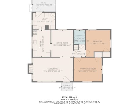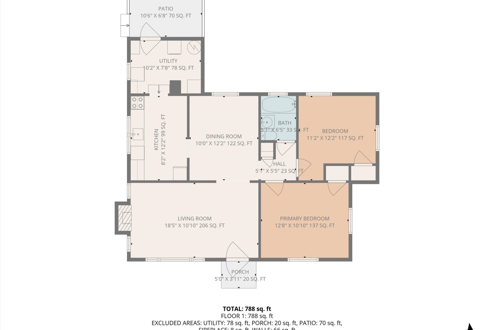 Total of 2 Bedrooms, 1 Full Bath, 970 +/- Square Feet