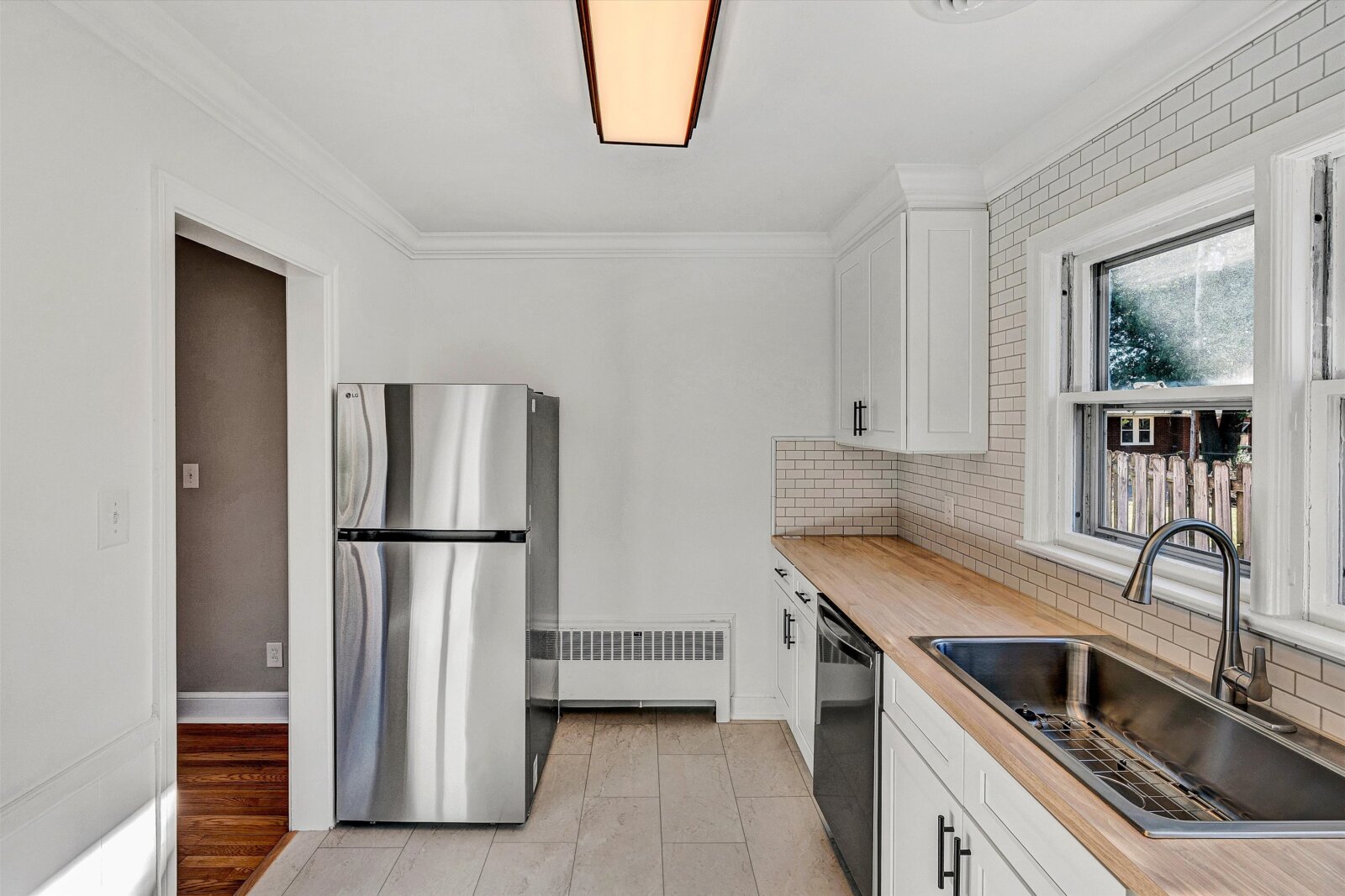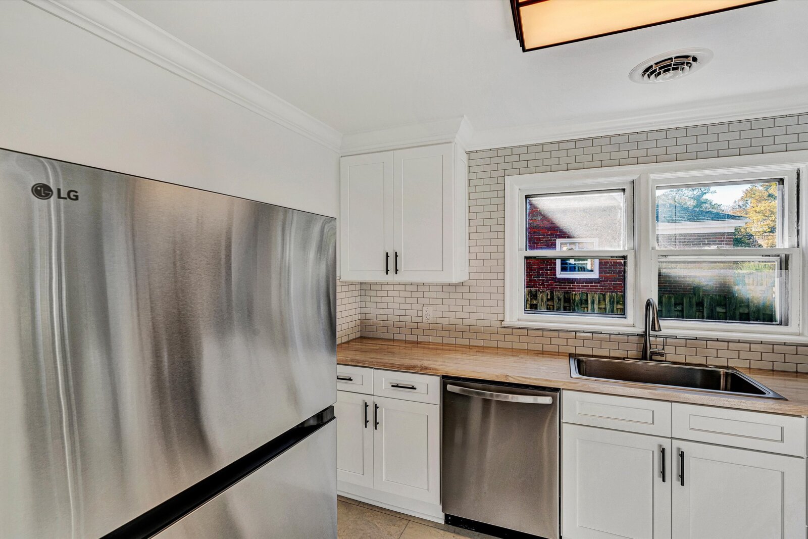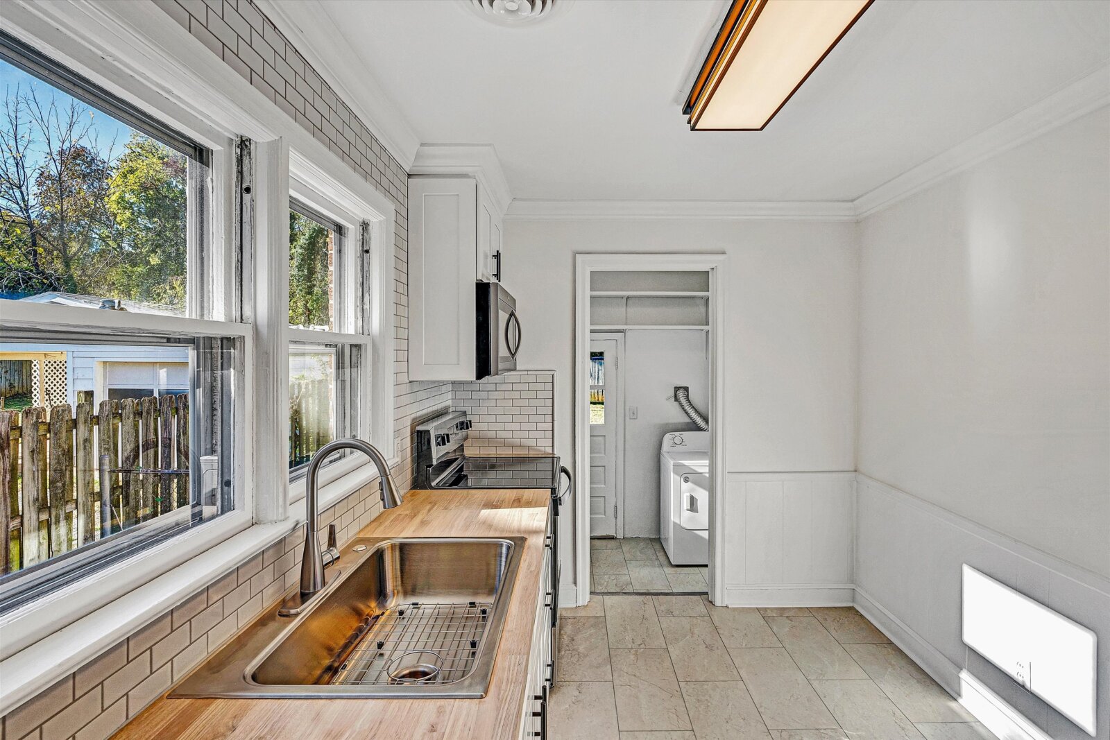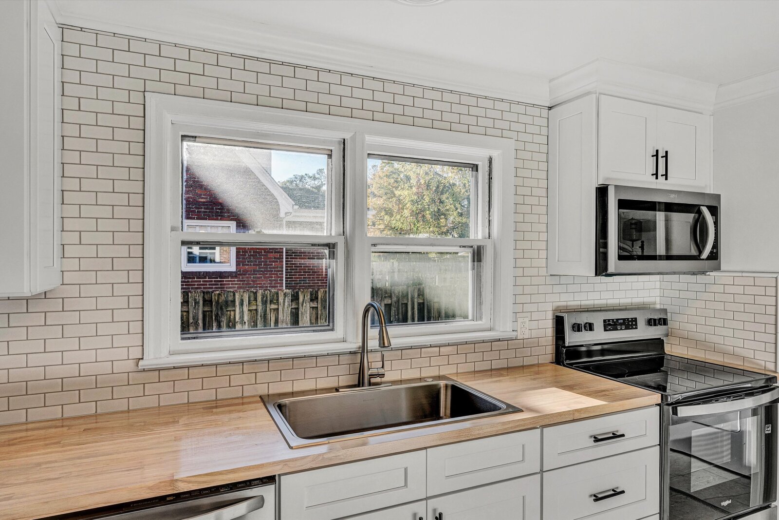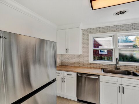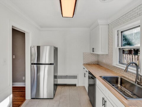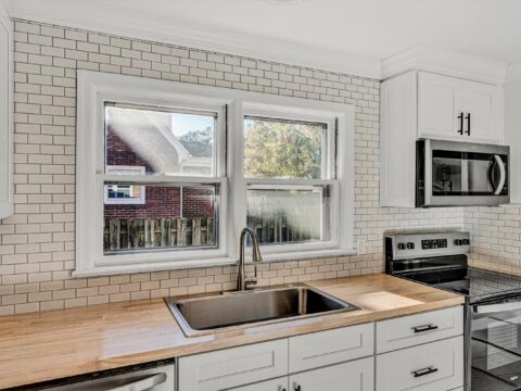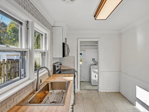 - Kitchen has new Shaker slow-close cabinets, butcher block, ceramic backsplash, flooring